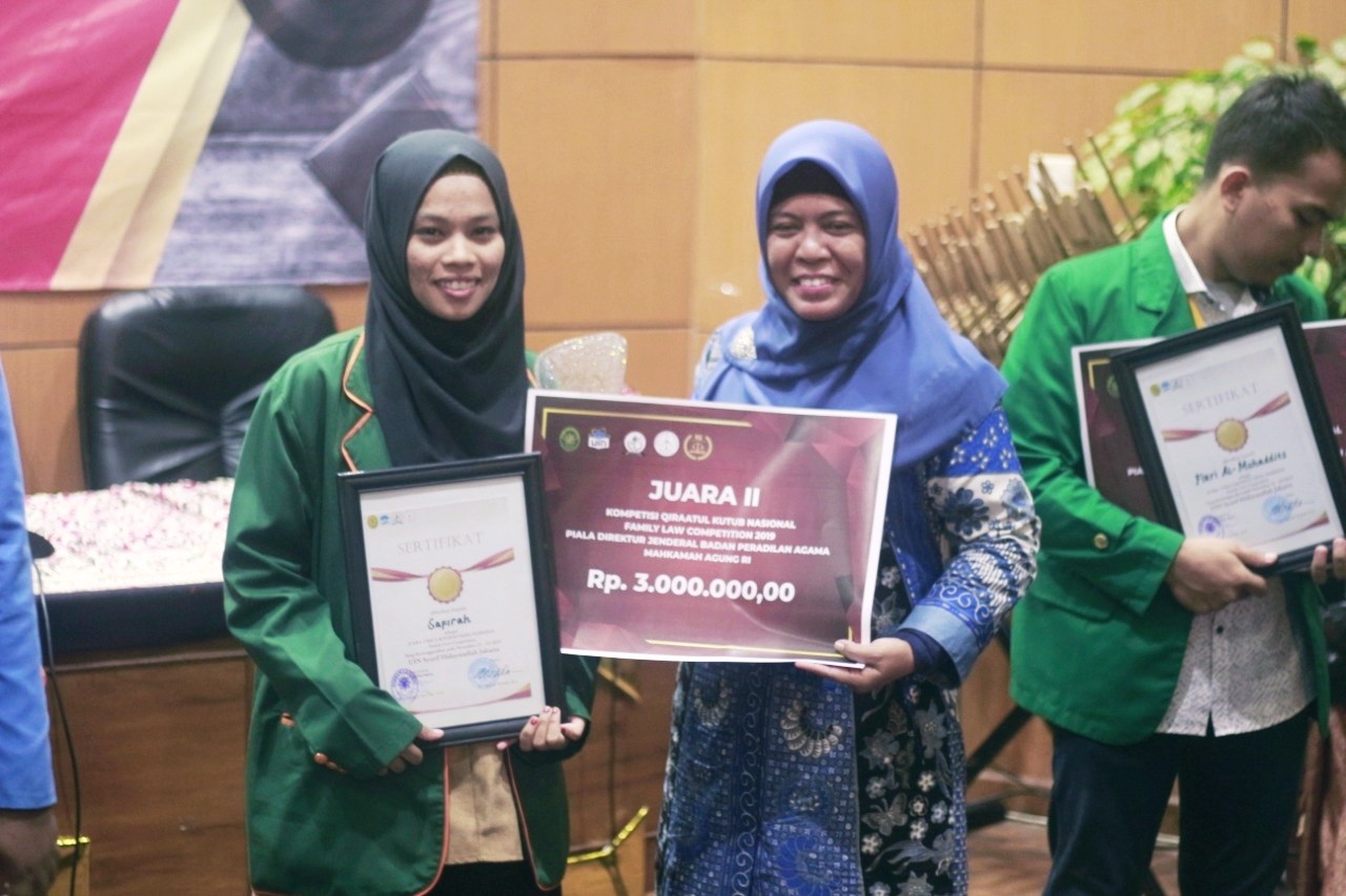 Namanya "Safirah Mukhlis" yang akrab disapa Fira, hari ini Sabtu tanggal 23 Nopember 2019 dinobatkan sebagai juara II (dua) Nasional Kompetisi Baca Kitab Kuning antar Mahasiswa Fakultas Syariah dan Hukum Perguruan Tinggi Ke-Islaman Se-Indonesia yang diselenggarakan oleh Himpunan Mahasiswa Prodi Hukum Keluarga Fakultas Syariah dan Hukum UIN Syarif Hadayatullah Jakarta bekerjasama dengan Direktorat Jenderal Badan Peradilan Agama Mahkamah Agung Repoblik Indonesia.